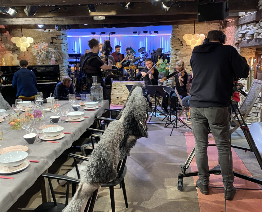 Här är det inte ett anonymt “hotellteam” som fixar allt i bakgrunden – det är ägarna Cecilia och Björn som lagar maten, serverar och håller ihop platsen medan inspelningen pågår. Och det är inte bara artisterna som ska ha mat: vi lagar frukost, lunch och middag även till ett crew på nära hundra personer – ett helt litet samhälle som plötsligt bor och jobbar hos oss.